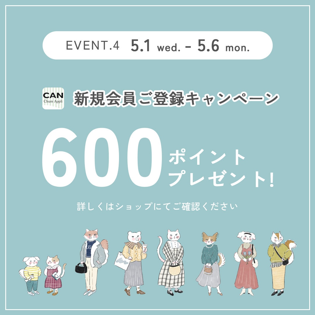 5/1(水)~5/6(月)の期間中、CAN Chumアプリに新規ご登録頂いたお客様には、その日のお買い物にすぐに使える600ptをプレゼント!ぜひこの機会にCANの輪にjoinしませんか?ダウンロードはこちらから>>