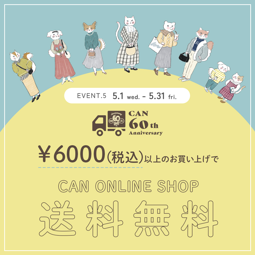 5/1(水)~5/31(金)の期間中、通常11,000円(税込)以上お買い上げで送料無料のところ、6,000円(税込)以上のお買い上げで送料無料に!CAN ONLINE SHOPはこちら>>