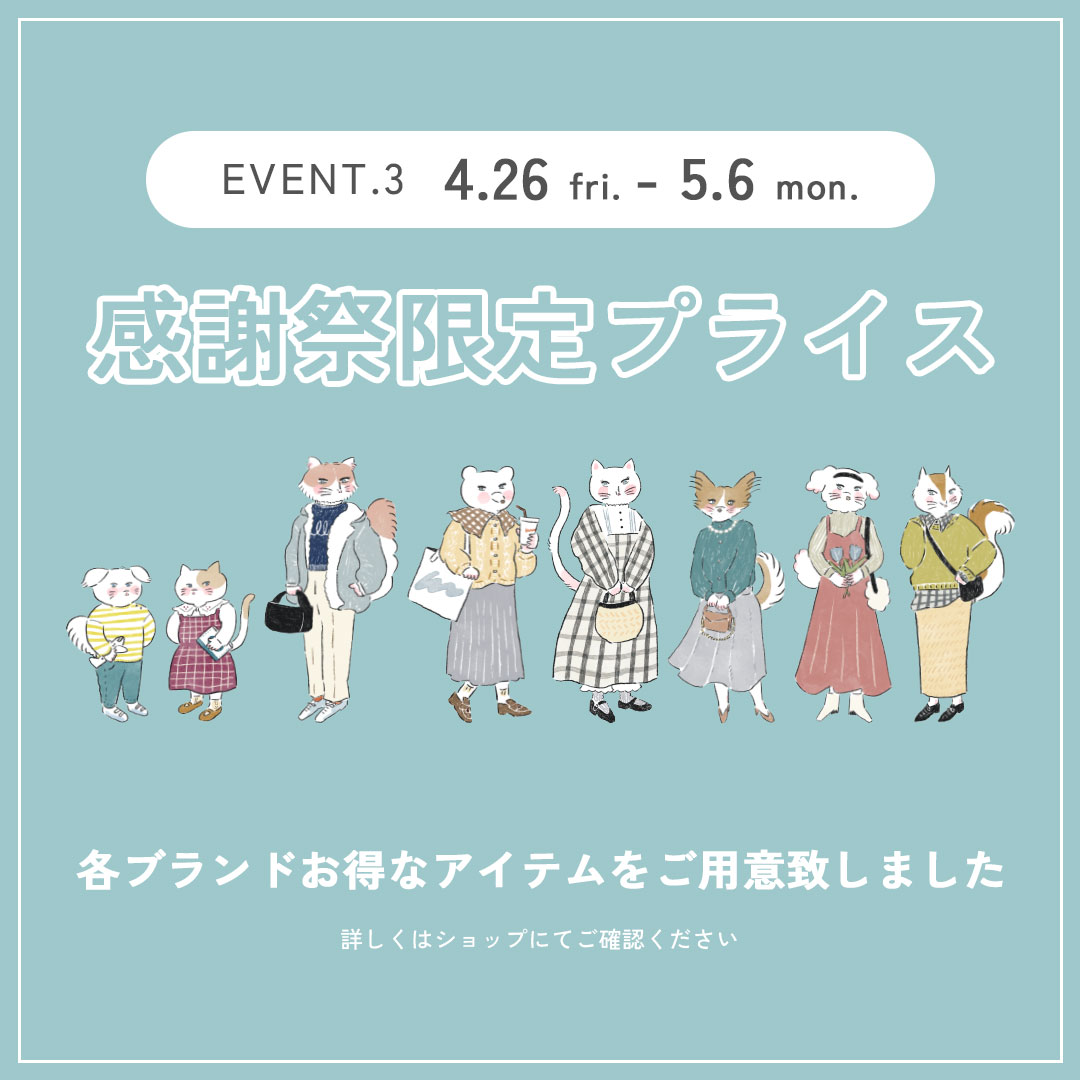 各ブランド、4/26(金)~5/6(月)の期間限定でお買い得なアイテムが登場致します。詳しくは各ブランドの公式Instagramをあわせてご覧ください♪